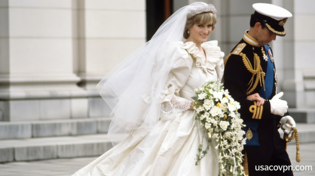 Lady Diana Spencer’s 1981 wedding to Prince Charles featured a white gown crafted by David Emanuel alongside his wife, Elizabeth. The ivory silk taffeta and lace creation, complete with a 25-foot train, captivated an estimated 750 million viewers watching on television worldwide.